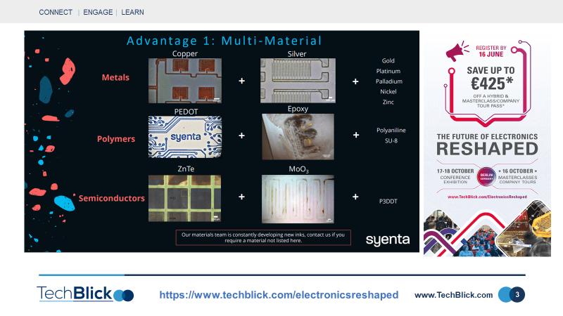 Syenta will be exhibiting in Berlin on 17-18 OCT 2023 - join us and the global industry to RESHAPE Electronics, making it Additive, Sustainable, Flexible, 3D and Wearable - learn more https://www.techblick.com/electronicsreshaped