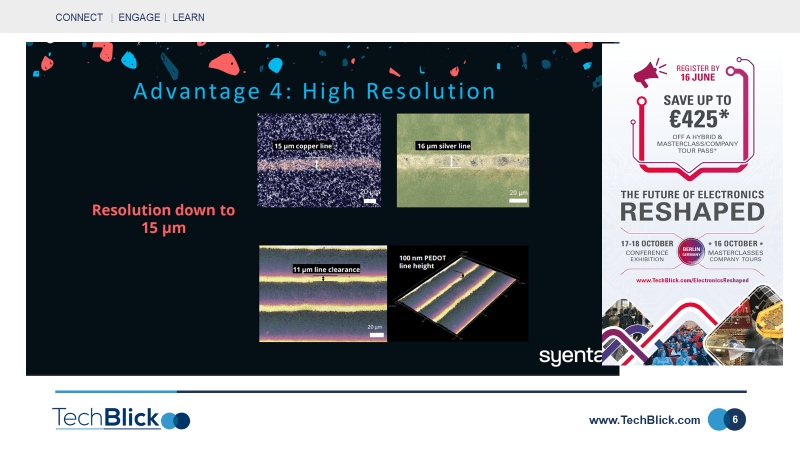 In slide [5], you can see also that this technique lends itself to very high resolution printing, achieving sub-20 um linewidths with different materials.