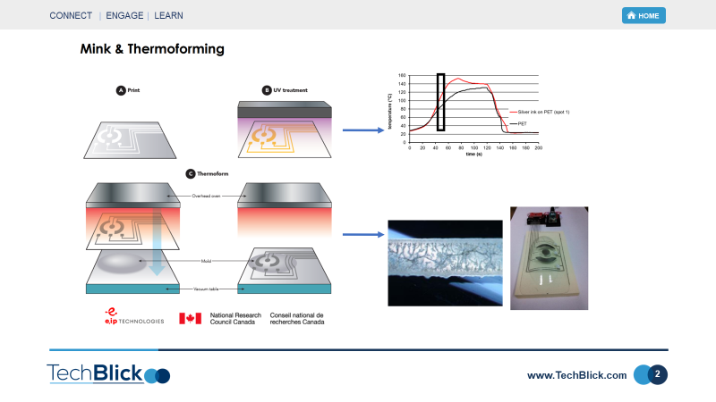 2- Partial sintering compatible with InMold Electronics: as part of the IME process, a thermoforming step is required. In this step, the substrate temperature is raised in a controlled fashion to soften the material, allowing it to be formed. In the proposed scheme, the printed molecular inks are first only partially cured by UV light. The full sintering then takes place in-situ by the elevated temperature of the 3D thermoforming process. This is an interesting approach because it enables faster curing and also allows one to sinter molecular inks on low-T substrates like PC.