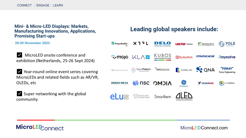 Join us on 29-30 NOV 2024 at MicroLED Connect to hear the latest from innovative players in microLEDs and quantum dots from around the world. The speakers include VueReal, Toray Engineering, eLux, Lextar, GE Research, Mikro Mesa, Q-Pixel, Delo, Mojo, Yole and many others